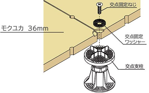 交点固定ねじ、交点固定ワッシャーにより、モクユカを簡単に固定することができます。また、独自の固定機構によりがたつきの少ない安定した床を形成します。